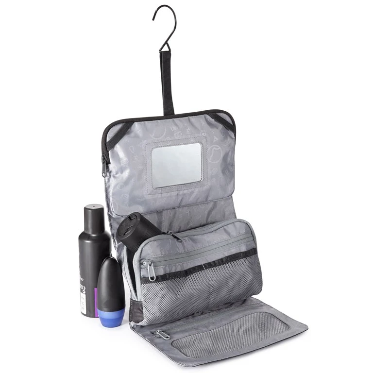Waszak met veel zakken en geïntegreerde spiegel die gemakkelijk op te rollen is. Eenmaal in de hotelkamer – uitrollen, ophangen en klaar!
